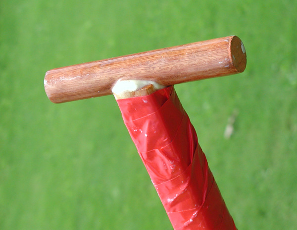 High Magnification POSSUP paddle handle. The handle of POSSUP paddle is a white cedar shaft with an oak dowel "T". Red tape is used for extra grip.